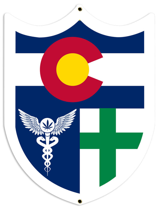 Colorado Flag, Green Cross, Medical Marijuana, Cannabis, Shield, Wall Decor, Cannabis Dispensary Decor, Man Cave Sign, Metal Sign 18"x24"