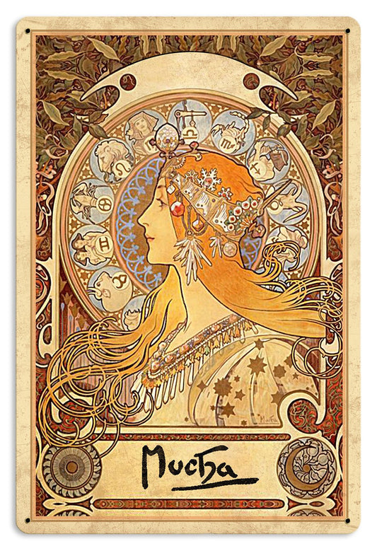 Mucha, Zociac, Metal Sign, Wall Decor, Nouveau Art 12"x18"