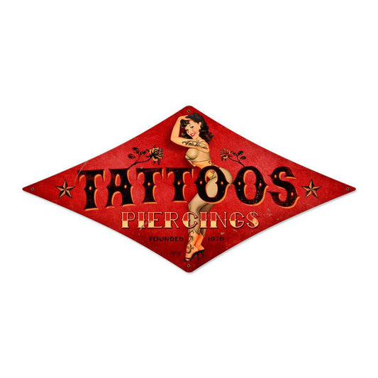 Tattoos, Pinup Girls, Diamond Metal Sign, 12 X 24 Inches