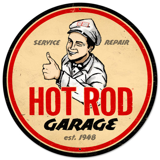 Hot Rod Garage, Automotive, Round Metal Sign, 28 X 28 Inches