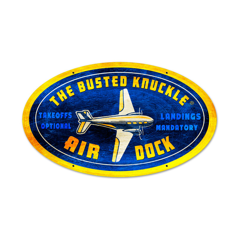 From the Busted Knuckle licensed collection, this Air Dock oval metal sign measures 24 inches by 14 inches and weighs in at 3 lb(s). This oval metal sign is hand made in the USA using heavy gauge American steel and a process known as sublimation, where the image is baked into a powder coating for a durable and long lasting finish. This oval metal sign