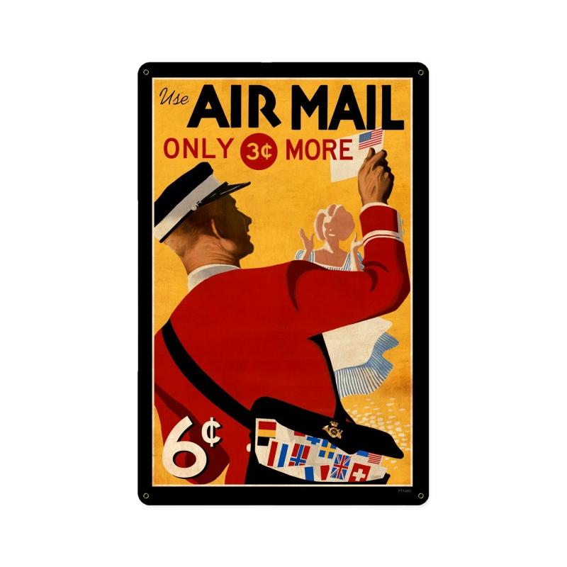 This Air Mail Postage Stamp metal sign measures 12 inches by 18 inches and weighs in at 2 lb(s). This metal sign is hand made in the USA using heavy gauge American steel and a process known as sublimation, where the image is baked into a powder coating for a durable and long lasting finish. This metal sign