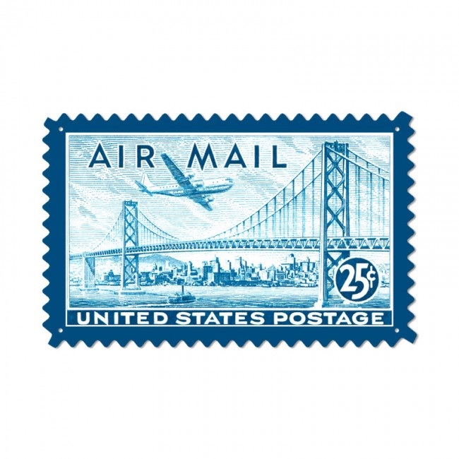 From the US Postal Service licensed collection, this Air Mail San Fran custom metal shape measures 24 inches by 15 inches and weighs in at 4 lb(s). This custom metal shape is hand made in the USA using heavy gauge American steel and a process known as sublimation, where the image is baked into a powder coating for a durable and long lasting finish. This custom metal shape
