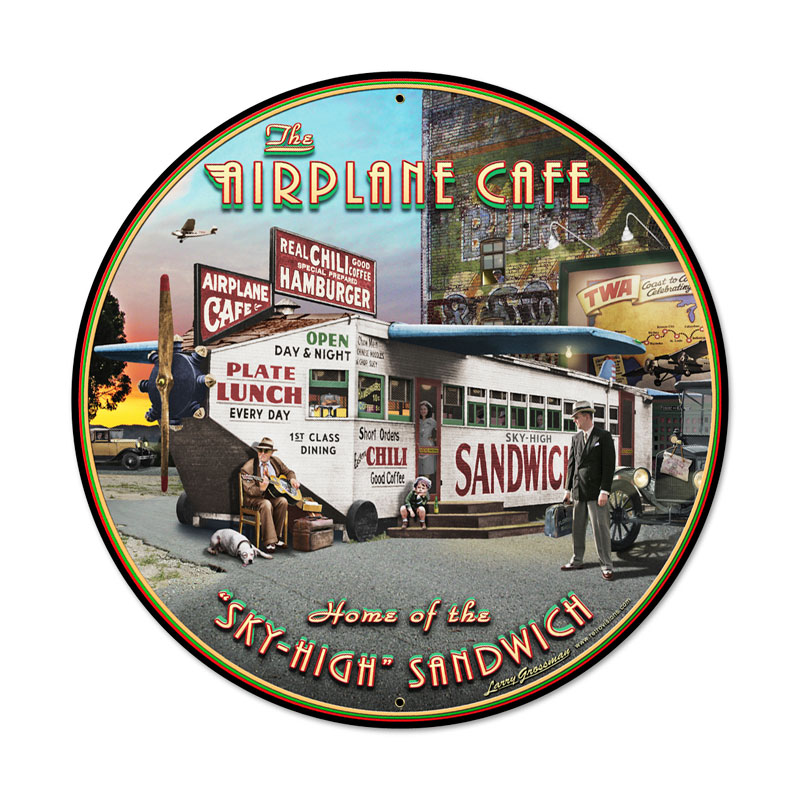From the Larry Grossman licensed collection, this Airplane Cafe round metal sign measures 28 inches by 28 inches and weighs in at 7 lb(s). This round metal sign is hand made in the USA using heavy gauge American steel and a process known as sublimation, where the image is baked into a powder coating for a durable and long lasting finish. This round metal sign