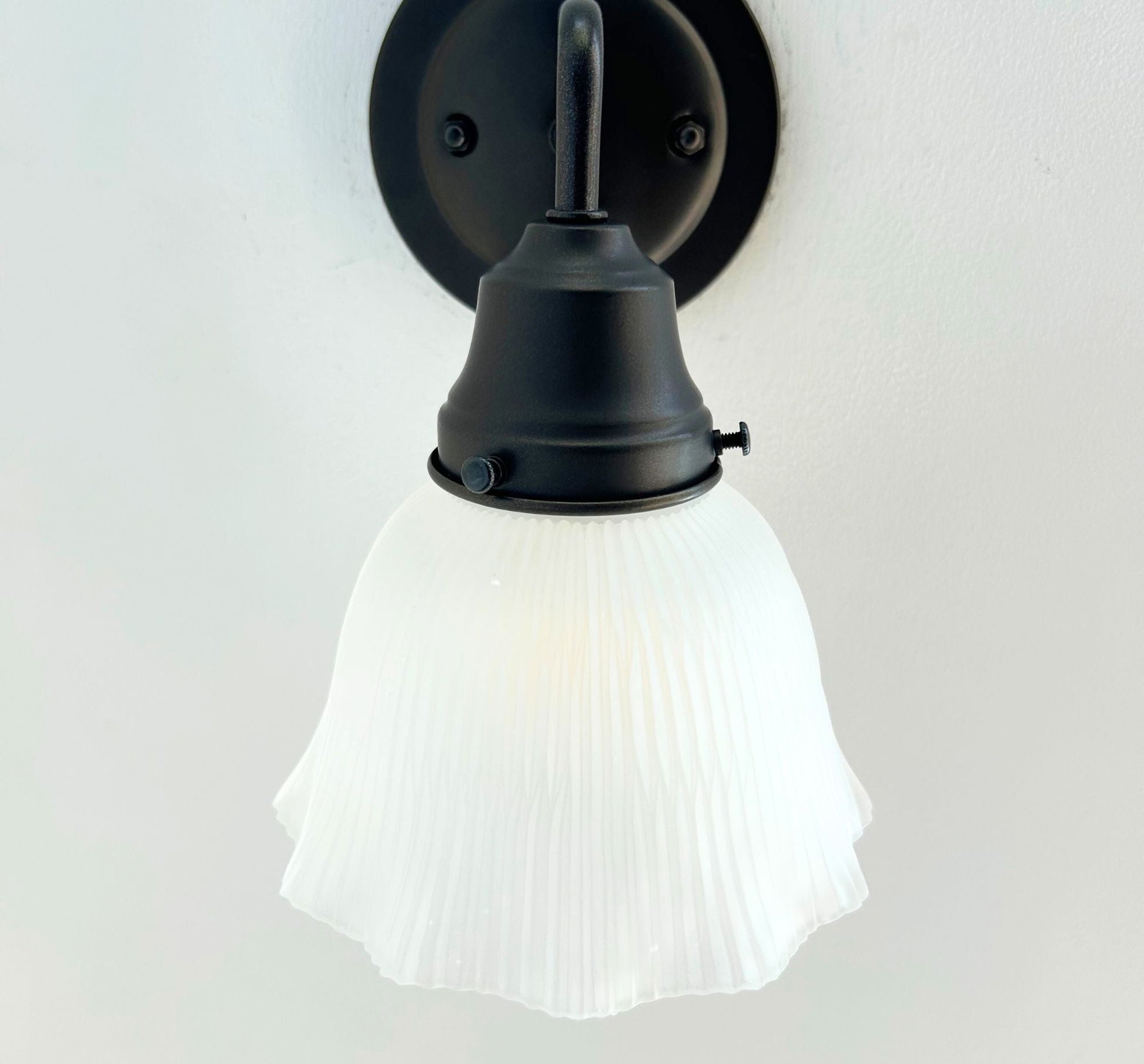 Featuring heavy vintage frosted glass with deep holophane texture, creating striking light patterns on the wall. Vintage antique glass is always a higher quality than what's made today and as an antique glass wall sconce light fixture, it gives plenty of sparkle. Note that antique glass may have imperfections (ex: bubbles)