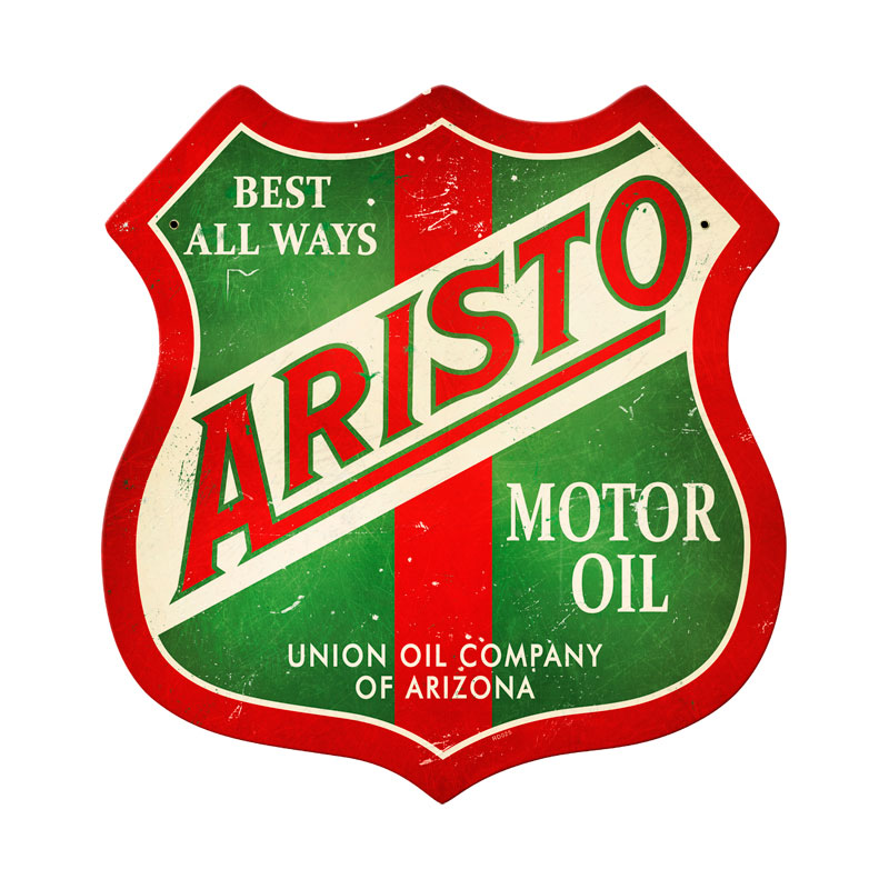 This Aristo Oil shield metal sign measures 15 inches by 15 inches and weighs in at 2 lb(s). This shield metal sign is hand made in the USA using heavy gauge American steel and a process known as sublimation, where the image is baked into a powder coating for a durable and long lasting finish. This shield metal sign