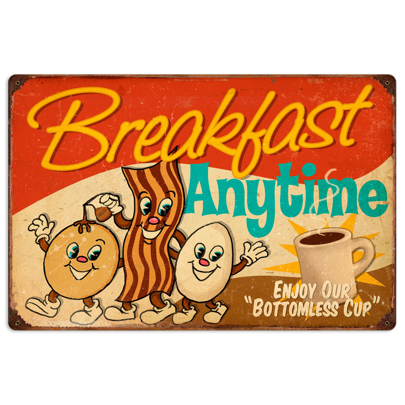 From the Retro Planet licensed collection, this Breakfast vintage metal sign measures 24 inches by 16 inches and weighs in at 4 lb(s). This vintage metal sign is hand made in the USA using heavy gauge American steel and a process known as sublimation, where the image is baked into a powder coating for a durable and long lasting finish. It then undergoes a vintaging process by hand to give it an aged look and feel. This vintage metal sign