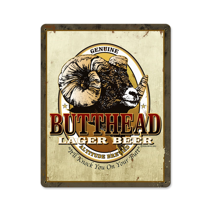 From the Ron Berg licensed collection, this Butthead Lager vintage metal sign measures 12 inches by 15 inches and weighs in at 2 lb(s). This vintage metal sign is hand made in the USA using heavy gauge American steel and a process known as sublimation, where the image is baked into a powder coating for a durable and long lasting finish. It then undergoes a vintaging process by hand to give it an aged look and feel. This vintage metal sign