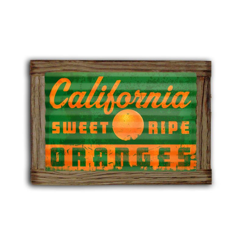 This California Oranges Corrugated Framed corrugated rustic barn wood sign measures 24 inches by 16 inches and weighs in at 5 lb(s). This corrugated rustic barn wood sign is hand made in the USA using heavy gauge American steel mounted on a reclaimed bard wood frame. It then undergoes a vintaging process by hand to give it an aged look and feel.