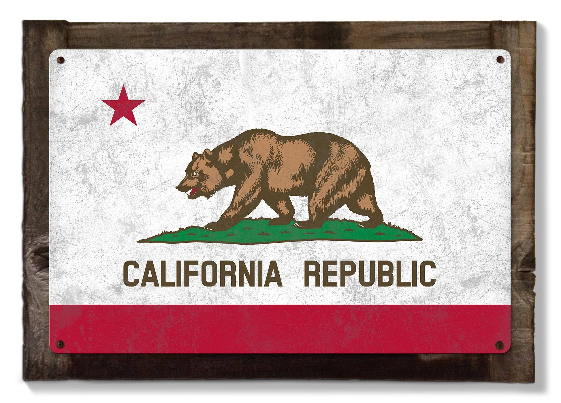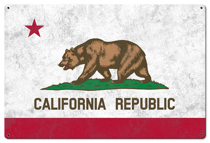 This charming California State Flag metal sign is made from 24 gauge American steel (No Flimsy Tin Here). Select from three different sizes: Large, Medium, Small. Also, available with an optional rustic wood frame. Designs are baked into a powder coating for a durable finish. Unlike other tin signs, canvas prints, and posters, our metal signs will not bend, fold, dent, or wrinkle over time. You can take a hammer to our signs. Our signs are hand made just like in the days. Rest assured these metal signs are made to last!