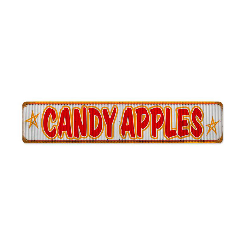 From the Retro Planet licensed collection, this Candy Apples metal sign measures 28 inches by 6 inches and weighs in at 2 lb(s). This metal sign is hand made in the USA using heavy gauge American steel and a process known as sublimation, where the image is baked into a powder coating for a durable and long lasting finish. This metal sign