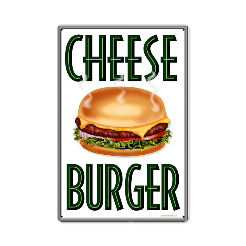 From the Retro Planet licensed collection, this Cheese Burger metal sign measures 12 inches by 18 inches and weighs in at 2 lb(s). This metal sign is hand made in the USA using heavy gauge American steel and a process known as sublimation, where the image is baked into a powder coating for a durable and long lasting finish. This metal sign