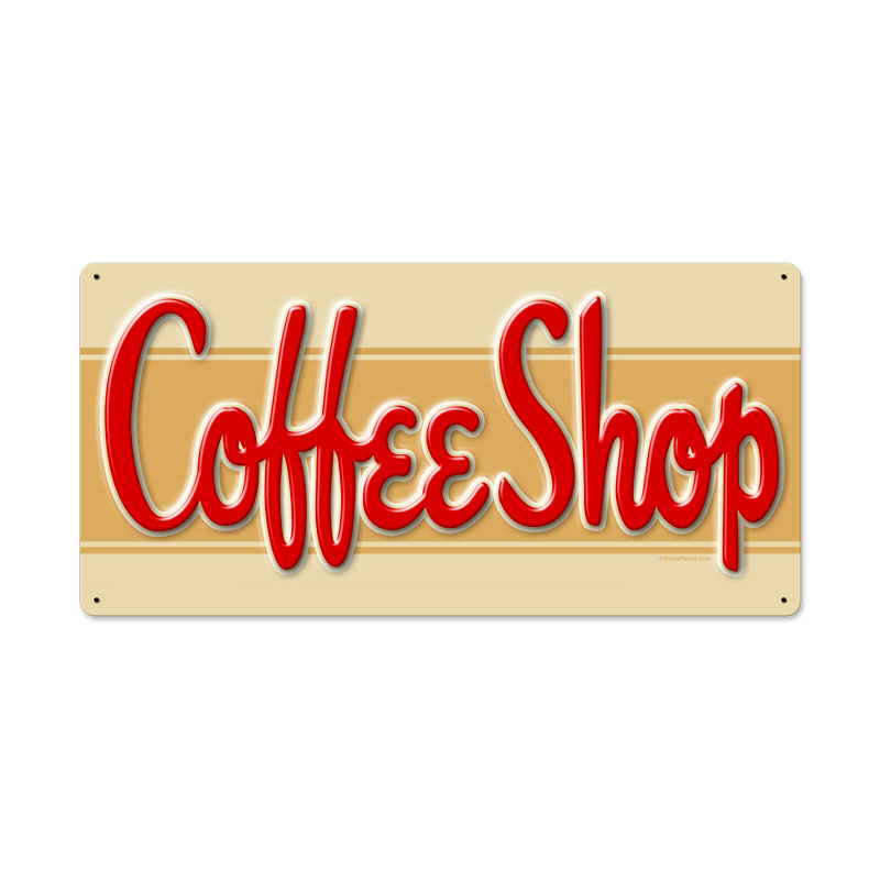 From the Retro Planet licensed collection, this Coffee Shop metal sign measures 24 inches by 12 inches and weighs in at 3 lb(s). This metal sign is hand made in the USA using heavy gauge American steel and a process known as sublimation, where the image is baked into a powder coating for a durable and long lasting finish. This metal sign