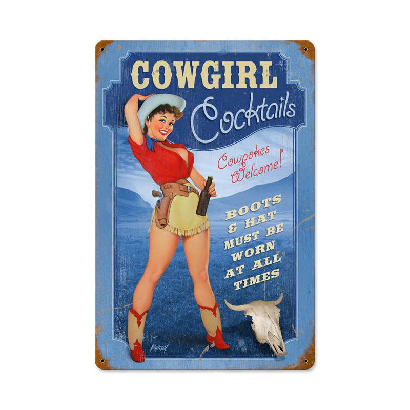 Cowgirl Cocktails, Pinup Girls, Vintage Metal Sign, 18 X 12 Inches