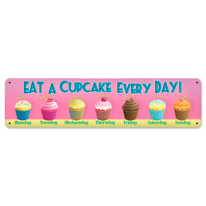 From the Retro Planet licensed collection, this Cupcake Everyday metal sign measures 20 inches by 5 inches and weighs in at 1 lb(s). This metal sign is hand made in the USA using heavy gauge American steel and a process known as sublimation, where the image is baked into a powder coating for a durable and long lasting finish. This metal sign