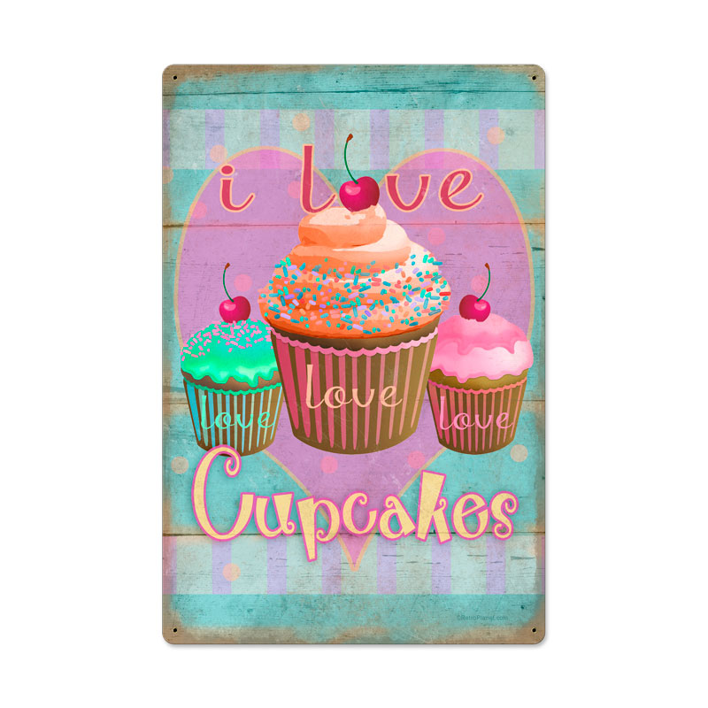 From the Retro Planet licensed collection, this Cupcake Love vintage metal sign measures 16 inches by 24 inches and weighs in at 4 lb(s). This vintage metal sign is hand made in the USA using heavy gauge American steel and a process known as sublimation, where the image is baked into a powder coating for a durable and long lasting finish. It then undergoes a vintaging process by hand to give it an aged look and feel. This vintage metal sign
