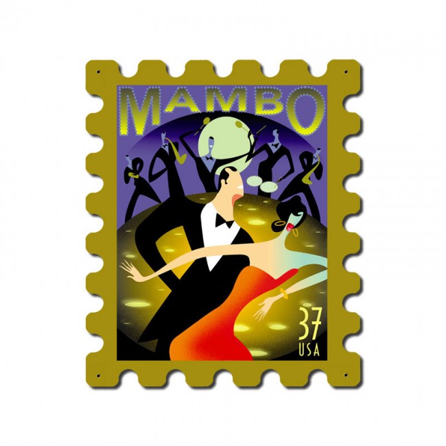 From the US Postal Service licensed collection, this Dance Mambo stamp metal sign measures 15 inches by 19 inches and weighs in at 3 lb(s). This stamp metal sign is hand made in the USA using heavy gauge American steel and a process known as sublimation, where the image is baked into a powder coating for a durable and long lasting finish. This stamp metal sign
