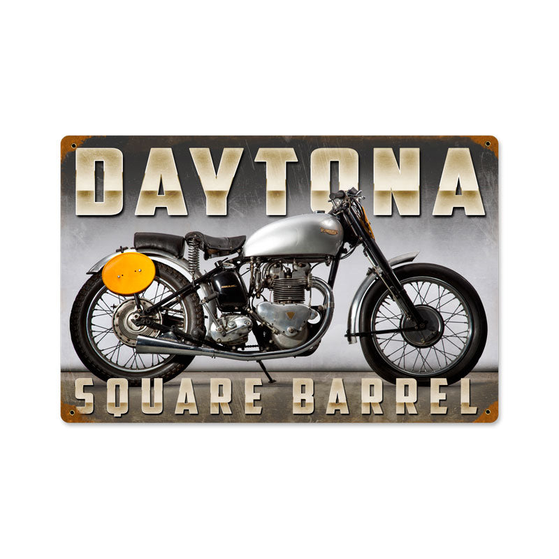 From the Classic Motorcycle licensed collection, this Daytona vintage metal sign measures 18 inches by 12 inches and weighs in at 2 lb(s). This vintage metal sign is hand made in the USA using heavy gauge American steel and a process known as sublimation, where the image is baked into a powder coating for a durable and long lasting finish. It then undergoes a vintaging process by hand to give it an aged look and feel. This vintage metal sign