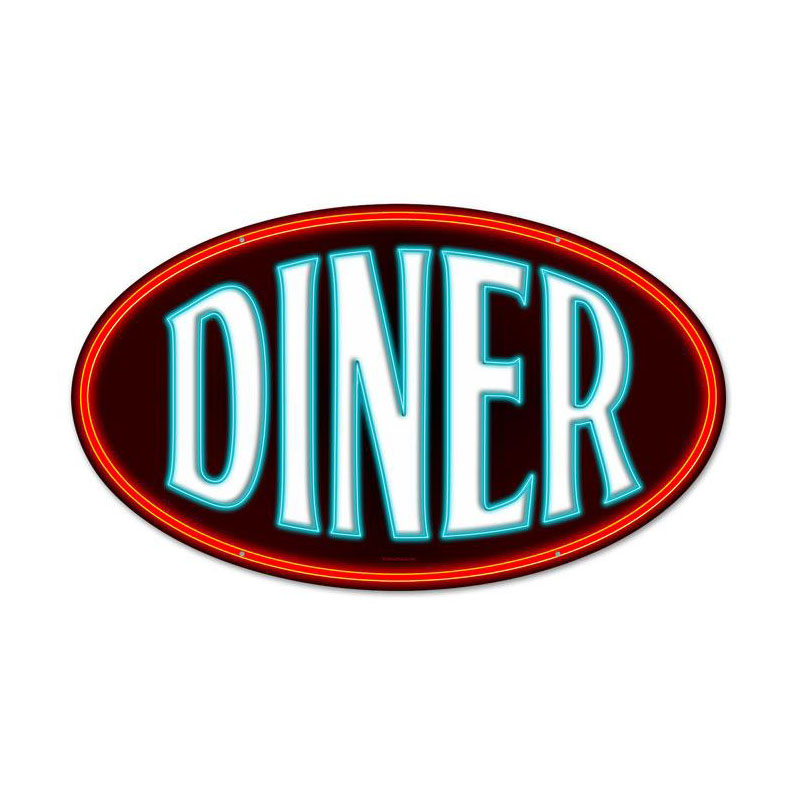 From the Retro Planet licensed collection, this Diner oval metal sign measures 14 inches by 24 inches and weighs in at 3 lb(s). This oval metal sign is hand made in the USA using heavy gauge American steel and a process known as sublimation, where the image is baked into a powder coating for a durable and long lasting finish. This oval metal sign