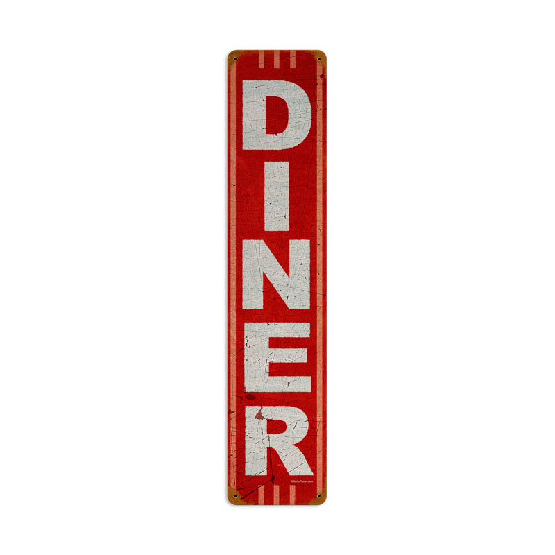 From the Retro Planet licensed collection, this Diner vintage metal sign measures 6 inches by 28 inches and weighs in at 2 lb(s). This vintage metal sign is hand made in the USA using heavy gauge American steel and a process known as sublimation, where the image is baked into a powder coating for a durable and long lasting finish. It then undergoes a vintaging process by hand to give it an aged look and feel. This vintage metal sign