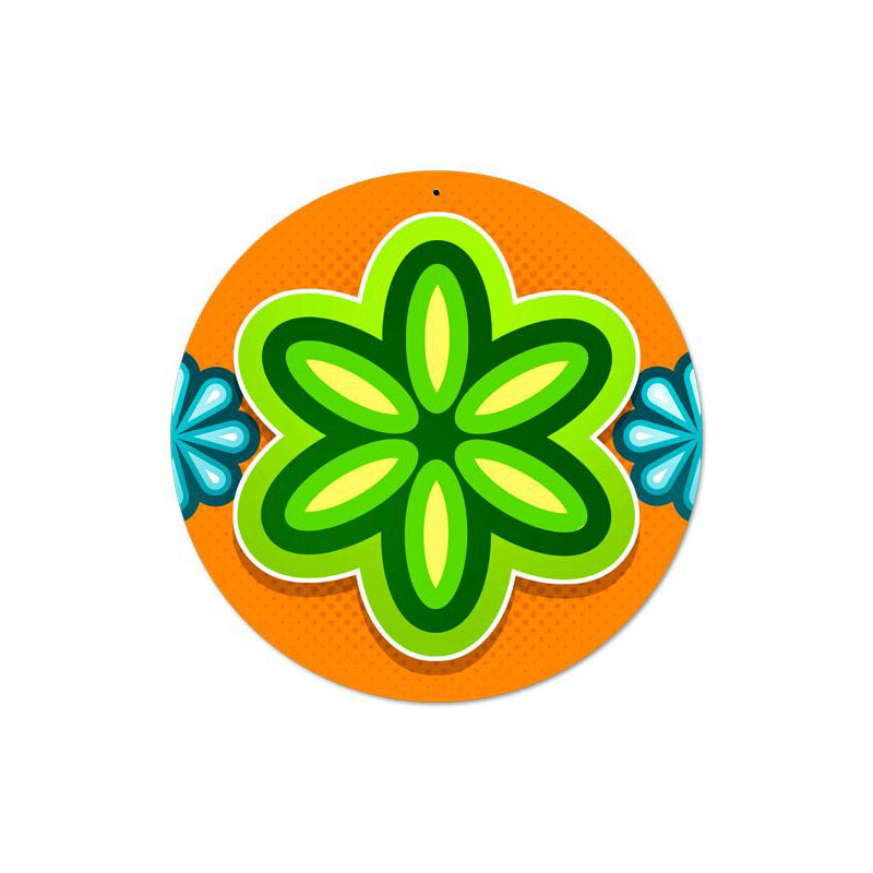 From the Retro Planet licensed collection, this Flower 2 round metal sign measures 14 inches by 14 inches and weighs in at 2 lb(s). This round metal sign is hand made in the USA using heavy gauge American steel and a process known as sublimation, where the image is baked into a powder coating for a durable and long lasting finish. This round metal sign
