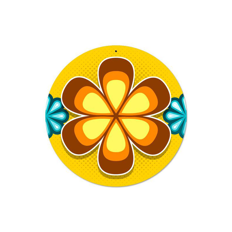 From the Retro Planet licensed collection, this Flower 3 round metal sign measures 14 inches by 14 inches and weighs in at 2 lb(s). This round metal sign is hand made in the USA using heavy gauge American steel and a process known as sublimation, where the image is baked into a powder coating for a durable and long lasting finish. This round metal sign