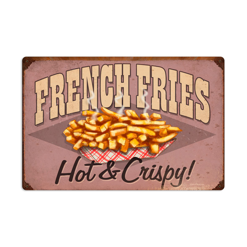 From the Retro Planet licensed collection, this French Fries vintage metal sign measures 24 inches by 16 inches and weighs in at 4 lb(s). This vintage metal sign is hand made in the USA using heavy gauge American steel and a process known as sublimation, where the image is baked into a powder coating for a durable and long lasting finish. It then undergoes a vintaging process by hand to give it an aged look and feel. This vintage metal sign