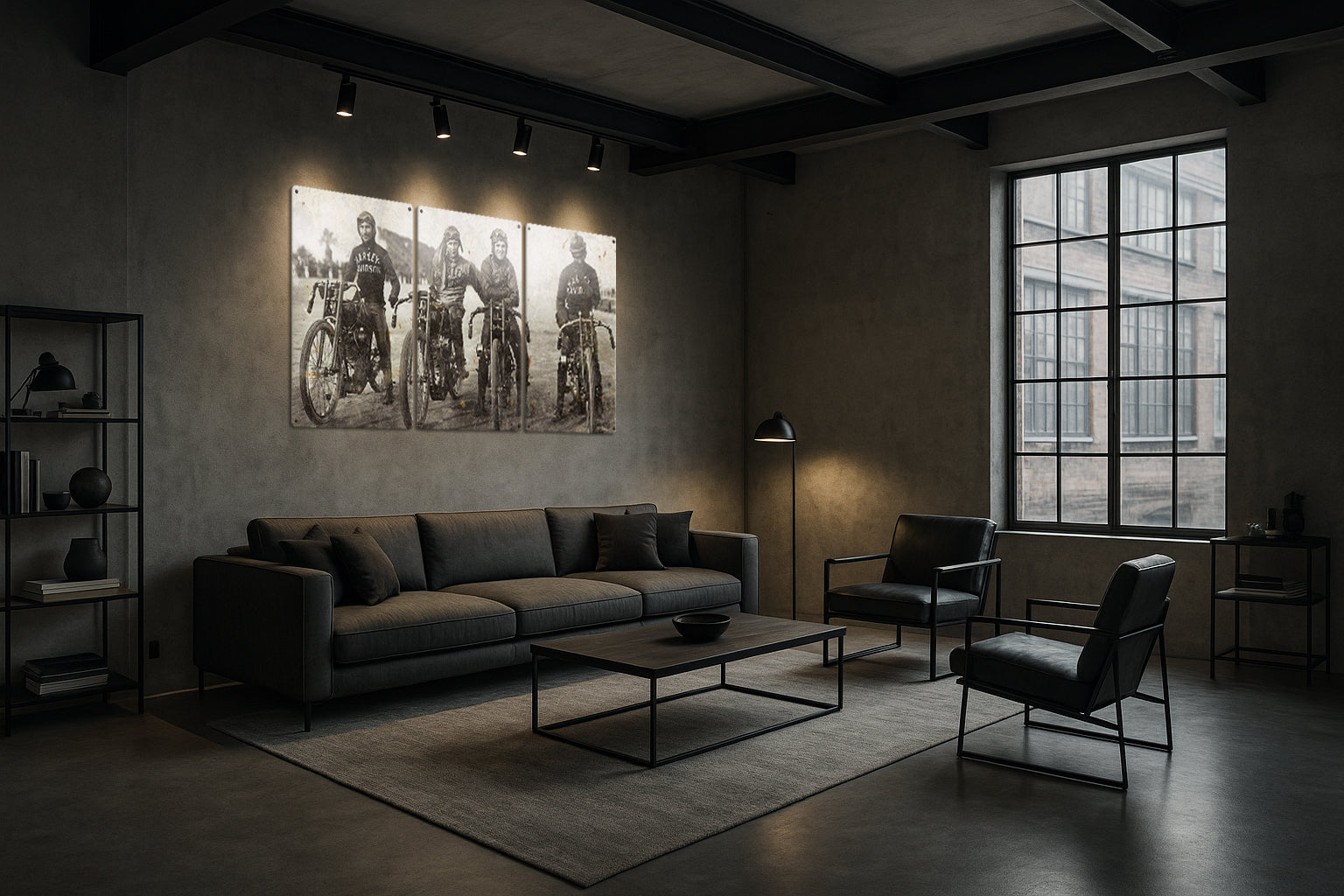 Crafted from premium heavy-gauge American steel, each panel features a vivid baked-on finish that preserves every detail—worn leathers, race-built Harley machines, and the unmistakable intensity of early 20th-century racing. When aligned together, the three wide-format panels create a dramatic centerpiece perfect for any garage, workshop, home bar, game room, or motorcycle-themed space.