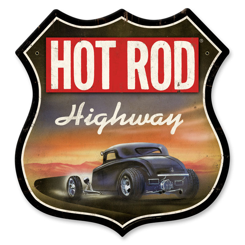 From the Hot Rod Magazine licensed collection, this Hot Rod Highway shield metal sign measures 28 inches by 28 inches and weighs in at 7 lb(s). This shield metal sign is hand made in the USA using heavy gauge American steel and a process known as sublimation, where the image is baked into a powder coating for a durable and long lasting finish. This shield metal sign