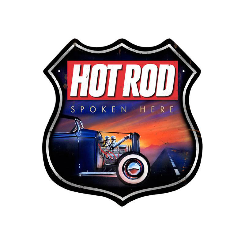 From the Hot Rod Magazine licensed collection, this Hot Rod Spoken Here shield metal sign measures 15 inches by 15 inches and weighs in at 2 lb(s). This shield metal sign is hand made in the USA using heavy gauge American steel and a process known as sublimation, where the image is baked into a powder coating for a durable and long lasting finish. This shield metal sign