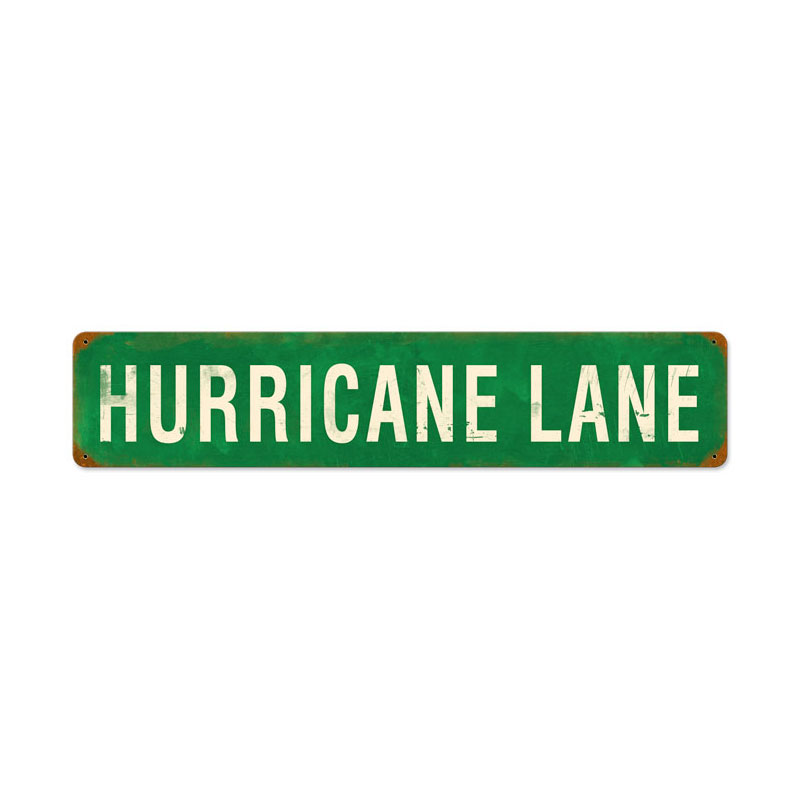 This Hurricane Lane vintage metal sign measures 28 inches by 6 inches and weighs in at 2 lb(s). This vintage metal sign is hand made in the USA using heavy gauge American steel and a process known as sublimation, where the image is baked into a powder coating for a durable and long lasting finish. It then undergoes a vintaging process by hand to give it an aged look and feel. This vintage metal sign