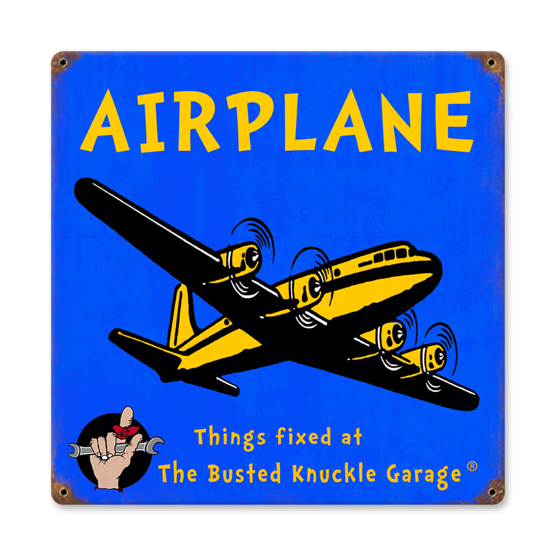 From the Busted Knuckle licensed collection, this Kids Airplane vintage metal sign measures 12 inches by 12 inches and weighs in at 2 lb(s). This vintage metal sign is hand made in the USA using heavy gauge American steel and a process known as sublimation, where the image is baked into a powder coating for a durable and long lasting finish. It then undergoes a vintaging process by hand to give it an aged look and feel. This vintage metal sign