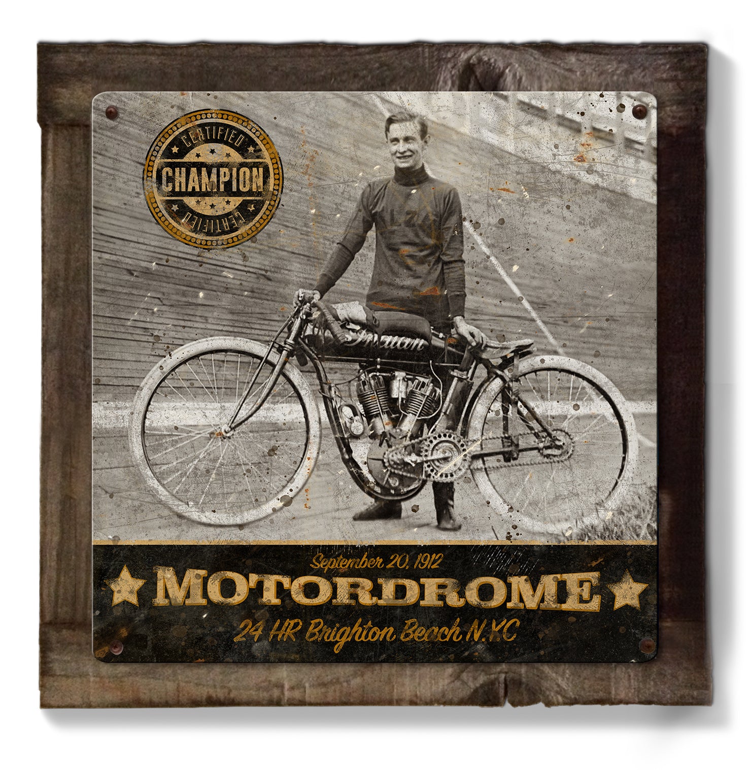 Majestic Motordrome Wall Art Vintage Indian Motorcycle METAL Sign is made from 24 gauge American steel (No Flimsy Tin Here). Select from three different sizes: Large, Medium, Small. Also, available with an optional rustic wood frame. Designs are baked into a powder coating for a durable finish. Unlike other tin signs, canvas prints, and posters, our metal signs will not bend, fold, dent, or wrinkle over time. You can take a hammer to our signs. Our signs are hand made just like in the days. Rest assured these metal signs are made to last!