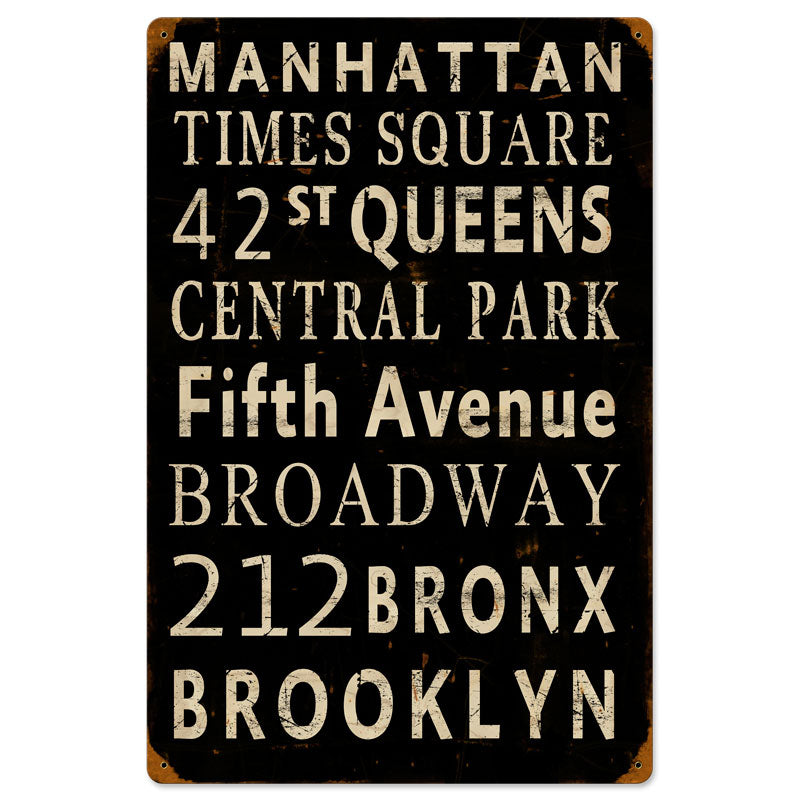 This New York Streets vintage metal sign measures 16 inches by 24 inches and weighs in at 3 lb(s). This vintage metal sign is hand made in the USA using heavy gauge American steel and a process known as sublimation, where the image is baked into a powder coating for a durable and long lasting finish. It then undergoes a vintaging process by hand to give it an aged look and feel. This vintage metal sign