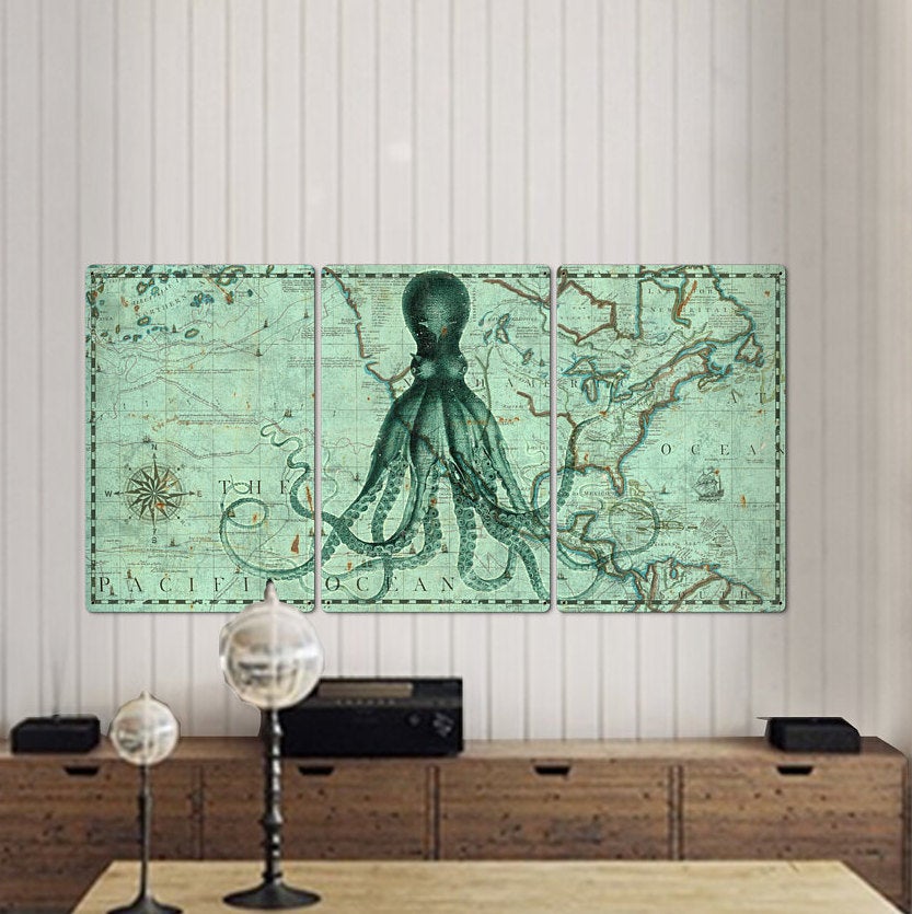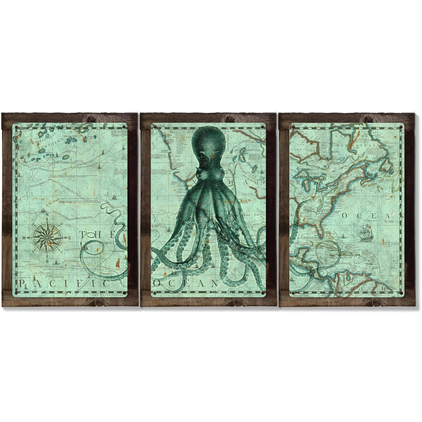 Octopus, Vintage Ship Route Map, Lord Bodner, Nautical, Ocean Life, Metal Triptych, Optional Rustic Wood Frame, Wall Art