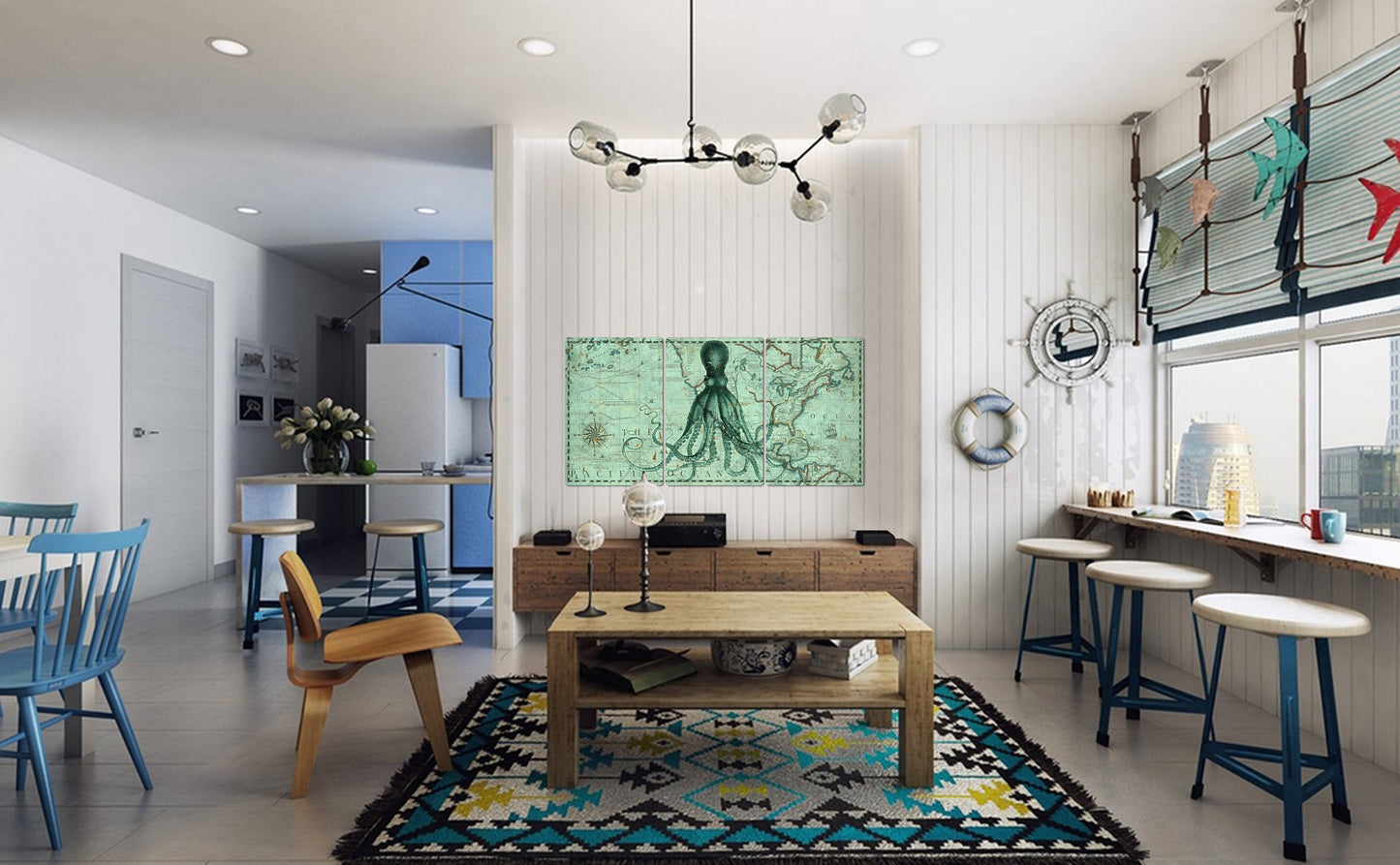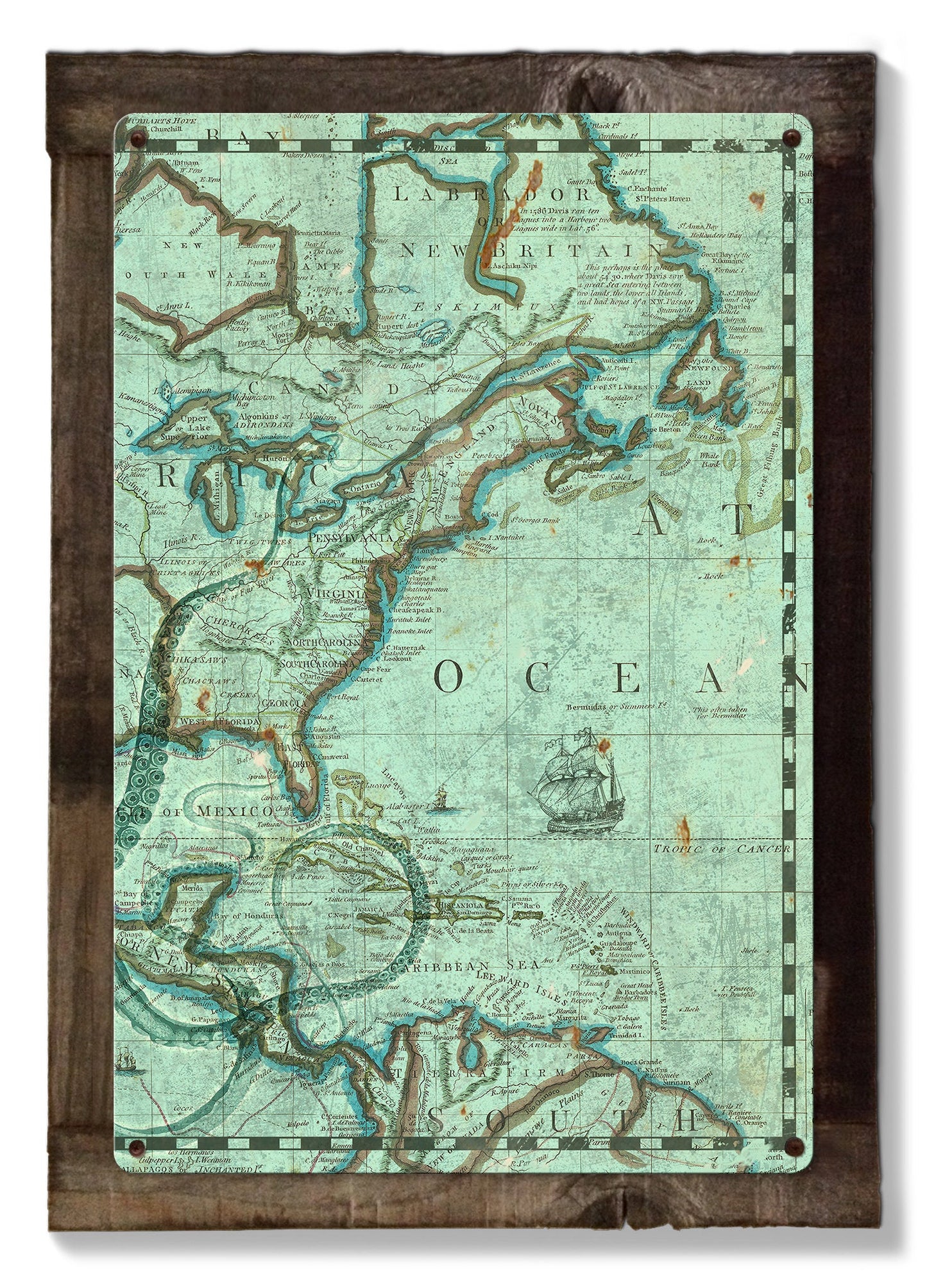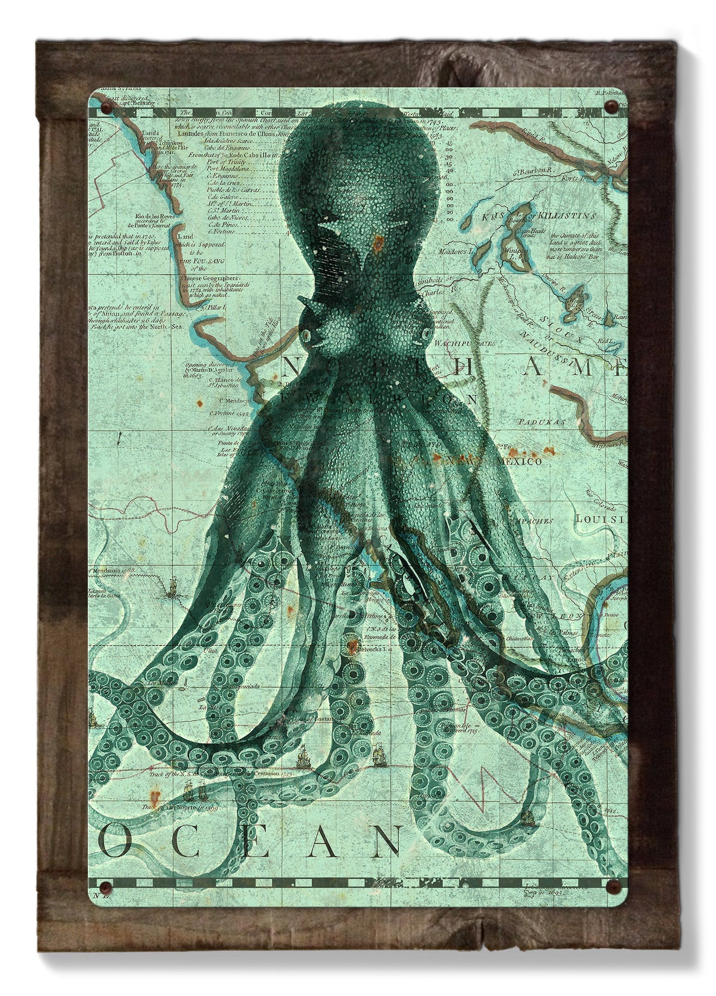 This outstanding Octopus Vintage Ship Route Map Metal Triptych is made from heavy gauge American steel (No Flimsy Tin Here). Select from three different sizes: Large, Medium, Small. Also, available with an optional rustic wood frame (See Options Below). Designs are baked into a powder coating for a durable finish. Unlike other tin signs, canvas prints, and posters, our metal signs will not bend, fold, dent, or wrinkle over time. You can take a hammer to our signs. Our signs are hand made just like in the days. Rest assured these metal signs are made to last. Great wall decor for nautical themed rooms, beach houses, sea life, Ocean life, offices, living rooms, industrial lofts, garages, man caves, government buildings, restaurants, bars and more. -----------------OPTIONS----------------- SIZE OPTIONS: (The wood frame option adds a 2" border to the total size of each panel. ) • Large - Measures a whopping 72" x 36". Each metal panel measures 24" x 36". With wood frame 84" x 40". • Medium - Measures 48" x 24". Each Panel measures 16" x 24". With wood frame 60" x 28". • Small - Measures 36" x 18". Each metal panel measures 12" x 18". With wood frame. 48" x 22". FRAME OPTIONS: • Wood Frame - Each framed panel comes mounted on reclaimed barn wood with rustic screws for an authentic look and feel. Also Comes with a small saw tooth metal hanger on the rear, ready to hang. The wood frame adds a 2" border to the total size of each panel. • No Frame - Metal signs with no frame have each corner drilled and riveted for easy hanging. ------------------------------------------------------ The octopus was originally printed by copperplate engraving in 1826 in London by scientist Lord Bodner as part of a series studying creatures of the deep. Ocean Life, Sea animals. MADE IN THE USA!