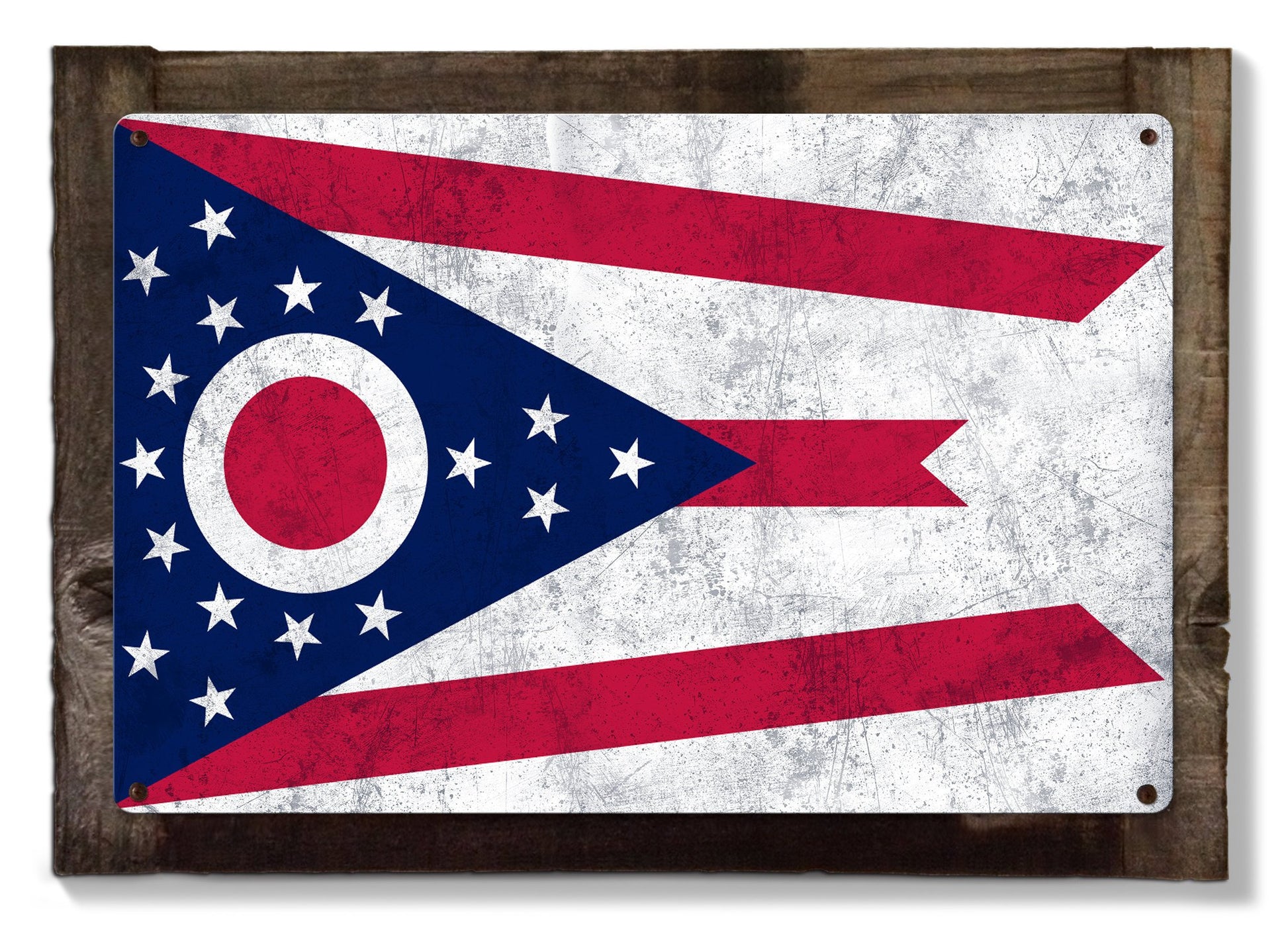 This charming Ohio State Flag metal sign is made from 24 gauge American steel (No Flimsy Tin Here). Select from three different sizes: Large, Medium, Small. Also, available with an optional rustic wood frame. Designs are baked into a powder coating for a durable finish. Unlike other tin signs, canvas prints, and posters, our metal signs will not bend, fold, dent, or wrinkle over time. You can take a hammer to our signs. Our signs are hand made just like in the days. Rest assured these metal signs are made to last!