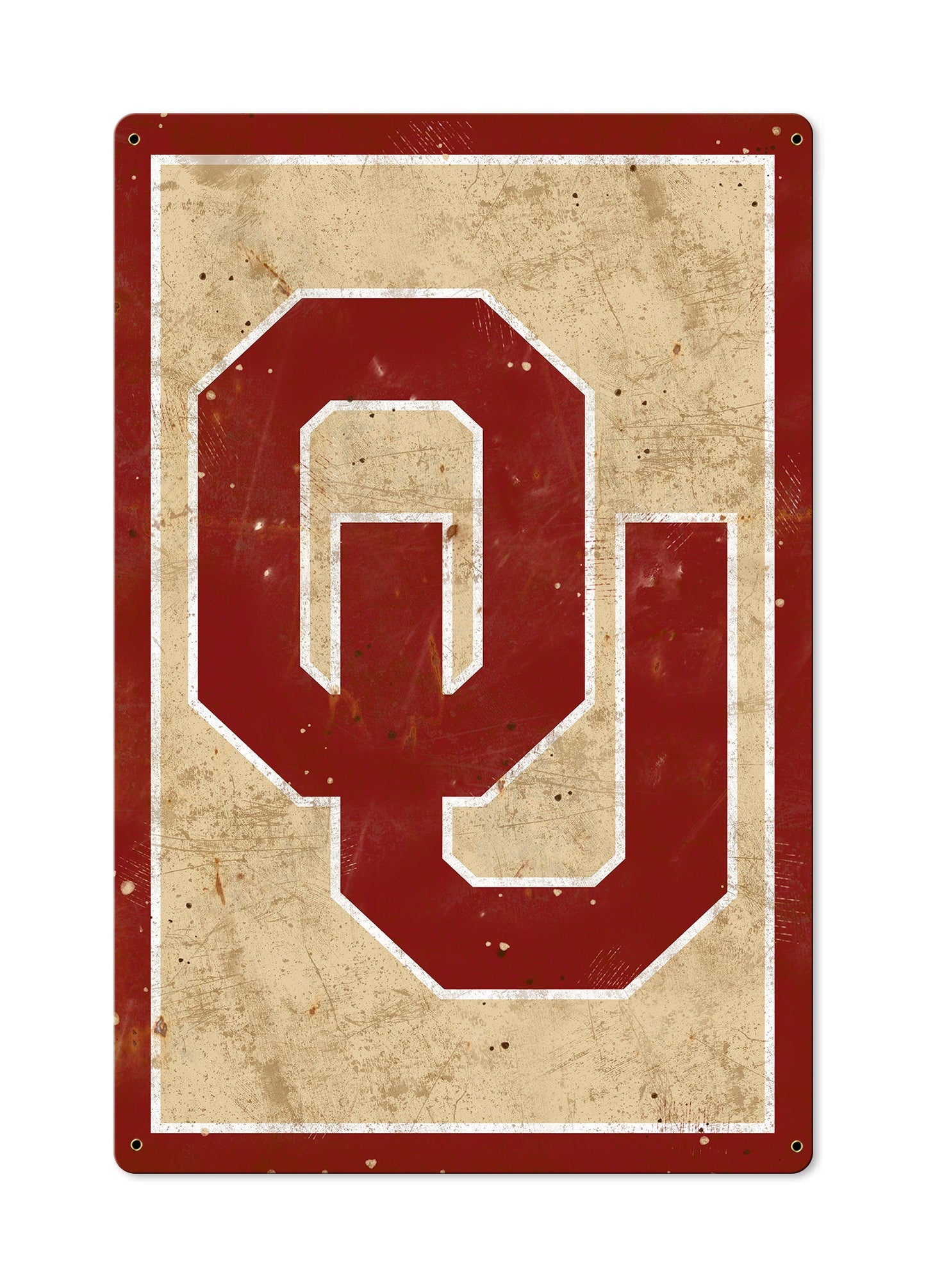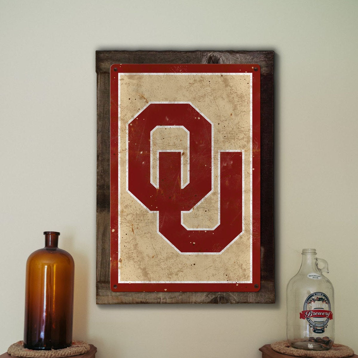 Original Oklahoma Sooners metal sign is made from 24 gauge American steel (No Flimsy Tin Here). Select from three different sizes: Large, Medium, Small. Also, available with an optional rustic wood frame. Designs are baked into a powder coating for a durable finish. Unlike other tin signs, canvas prints, and posters, our metal signs will not bend, fold, dent, or wrinkle over time. You can take a hammer to our signs. Our signs are hand made just like in the days. Rest assured these metal signs are made to last! Great wall decor for Game Rooms, College Dorms, Frat Houses, Bars, Offices, living rooms, industrial lofts, garages, man caves, government buildings and more. Support and show your school spirit with this team mascot metal sign! -----------------OPTIONS----------------- SIZES: Large - Measures 36" x 24" Medium - Measures 24" x 16" Small - Measures 18" x 12" FRAMED: Framed signs come mounted on reclaimed barn wood with rustic screws for an authentic look and feel. Also Comes with a small saw tooth metal hanger on the rear, ready to hang. NO FRAME: Metal signs with no frame come drilled and riveted for easy hanging. ------------------------------------------------- The University of Oklahoma was a charter member of the Southwest Athletic Conference (SWC) during its formation in 1914. Five years later, in 1919, OU left the SWC and joined the Missouri Valley Intercollegiate Athletic Association. In 1928, this conference split, and OU remained aligned with the teams that formed the Big Six Conference. Over the next 31 years, more schools were added and the conference underwent several name changes, incrementing the number each time up to the Big Eight Conference where it remained until 1996. Four Texas schools joined with the members of Big Eight to form the current Big 12 Conference. When combined with Blake Griffin's John Wooden Award and Sam Bradford's Heisman Trophy, Oklahoma became the second school to have a top winner in both basketball and football in the same year (in 1968, Gary Beban won the Heisman Trophy and Kareem Abdul-Jabbar won the USBWA "Player of the Year" award for UCLA). MADE IN THE USA! www.MetalSignBarn.com