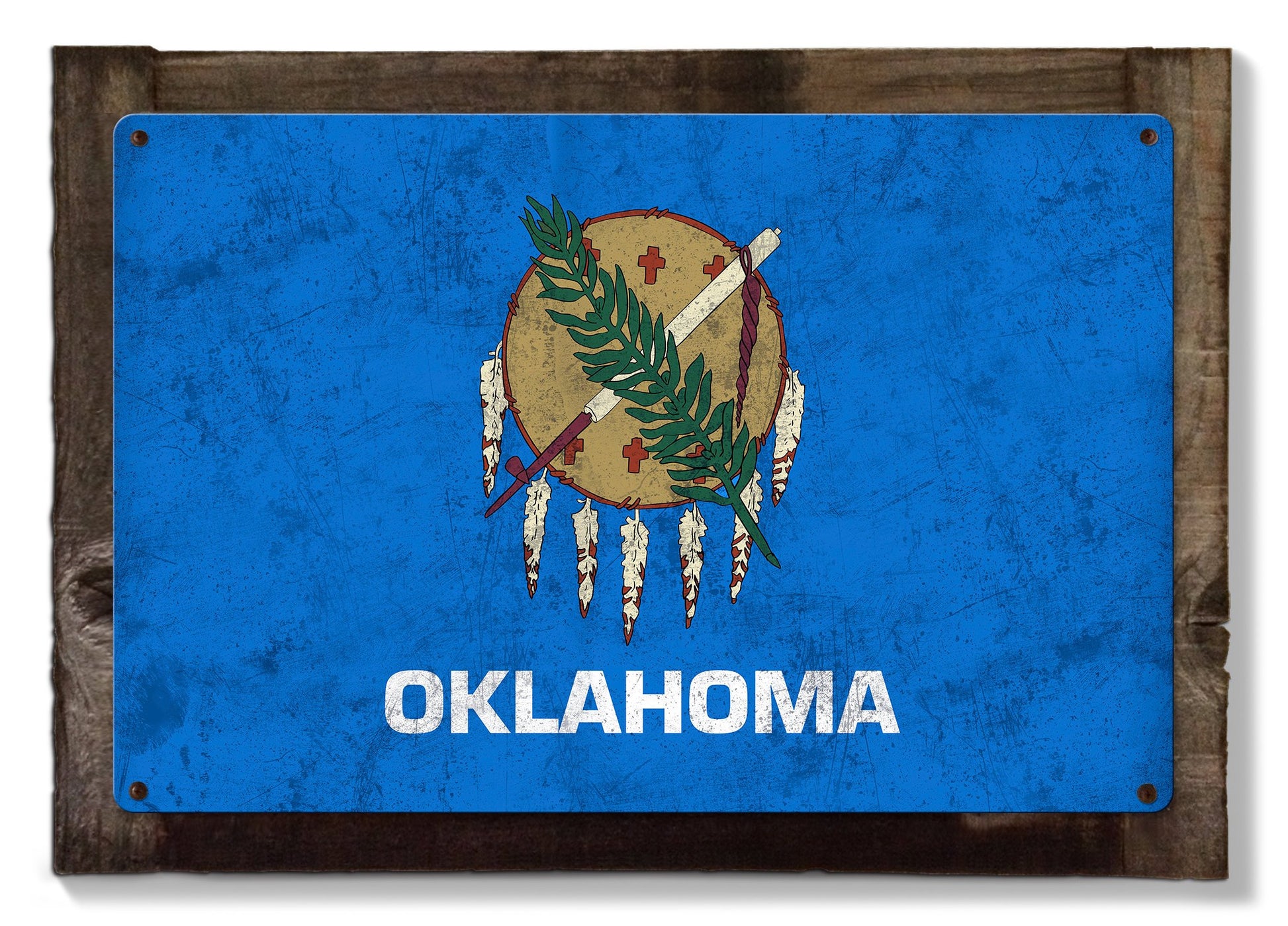 This charming Oklahoma State Flag metal sign is made from 24 gauge American steel (No Flimsy Tin Here). Select from three different sizes: Large, Medium, Small. Also, available with an optional rustic wood frame. Designs are baked into a powder coating for a durable finish. Unlike other tin signs, canvas prints, and posters, our metal signs will not bend, fold, dent, or wrinkle over time. You can take a hammer to our signs. Our signs are hand made just like in the days. Rest assured these metal signs are made to last!