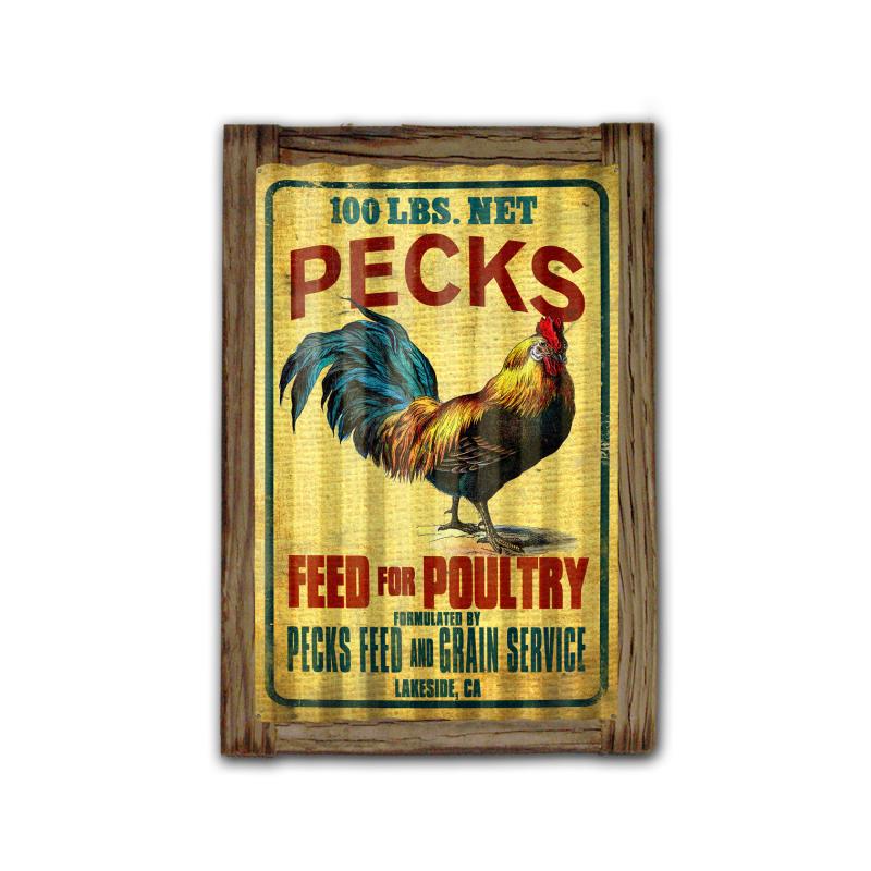 Pecks Rooster Feed Corrugated Framed, Food and Drink, Corrugated Rustic Barn Wood Sign, 16 X 24 Inches
