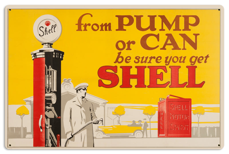 From the Shell licensed collection, this Pump Can Metal Sign measures 24 inches by 16 inches and weighs in at 4 lb(s). This Metal Sign is hand made in the USA using heavy gauge American steel.