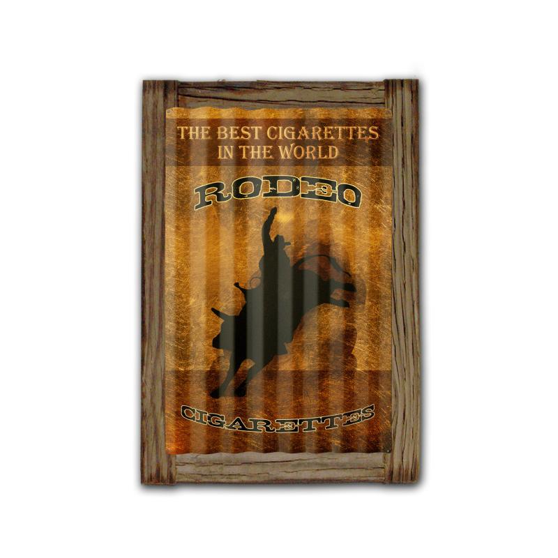 This Rodeo Cigarettes Corrugated corrugated rustic barn wood sign measures 16 inches by 24 inches and weighs in at 5 lb(s). This corrugated rustic barn wood sign is hand made in the USA using heavy gauge American steel mounted on a reclaimed bard wood frame. It then undergoes a vintaging process by hand to give it an aged look and feel.