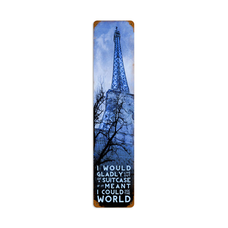 This See The World vintage metal sign measures 6 inches by 28 inches and weighs in at 2 lb(s). This vintage metal sign is hand made in the USA using heavy gauge American steel and a process known as sublimation, where the image is baked into a powder coating for a durable and long lasting finish. It then undergoes a vintaging process by hand to give it an aged look and feel. This vintage metal sign