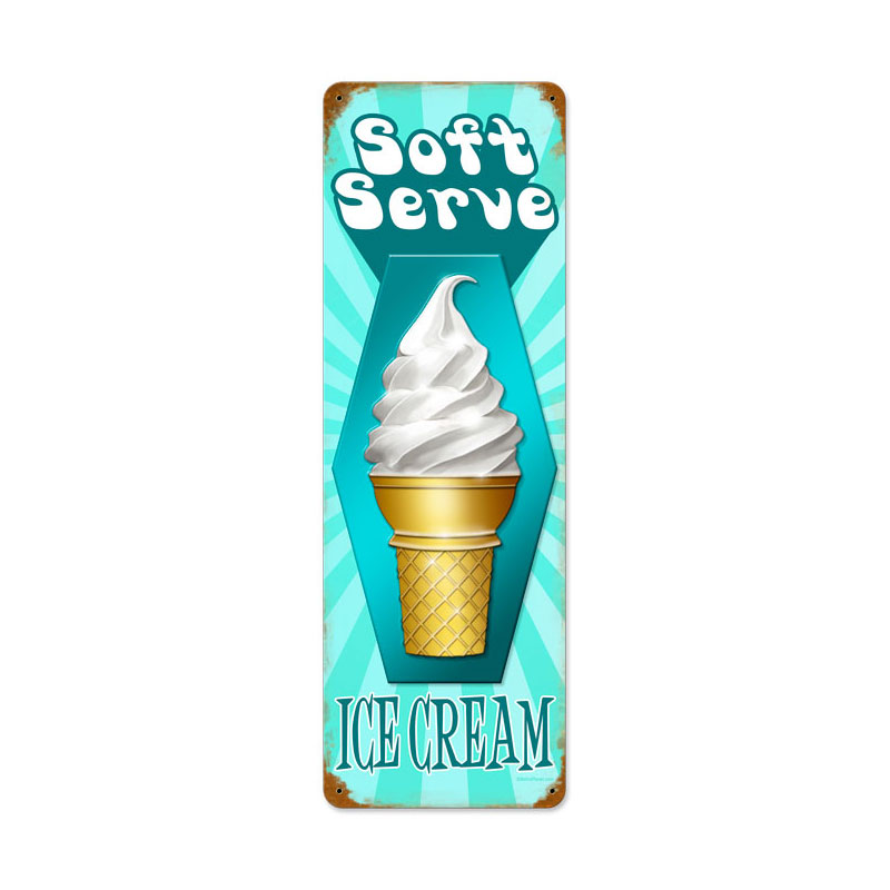 From the Retro Planet licensed collection, this Soft Serve vintage metal sign measures 8 inches by 24 inches and weighs in at 2 lb(s). This vintage metal sign is hand made in the USA using heavy gauge American steel and a process known as sublimation, where the image is baked into a powder coating for a durable and long lasting finish. It then undergoes a vintaging process by hand to give it an aged look and feel. This vintage metal sign