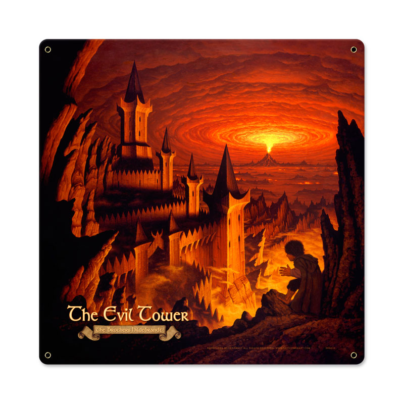 From the Brothers Hildebrandt - Lord of the Rings licensed collection, this The Evil Tower custom metal shape measures 18 inches by 18 inches and weighs in at 4 lb(s). This custom metal shape is hand made in the USA using heavy gauge American steel and a process known as sublimation, where the image is baked into a powder coating for a durable and long lasting finish. This custom metal shape