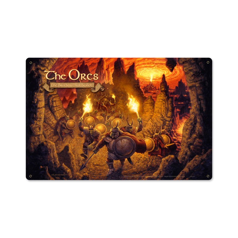 From the Brothers Hildebrandt Lord of the Rings licensed collection, this The Orcs metal sign measures 18 inches by 12 inches and weighs in at 2 lb(s). This metal sign is hand made in the USA using heavy gauge American steel and a process known as sublimation, where the image is baked into a powder coating for a durable and long lasting finish. This metal sign