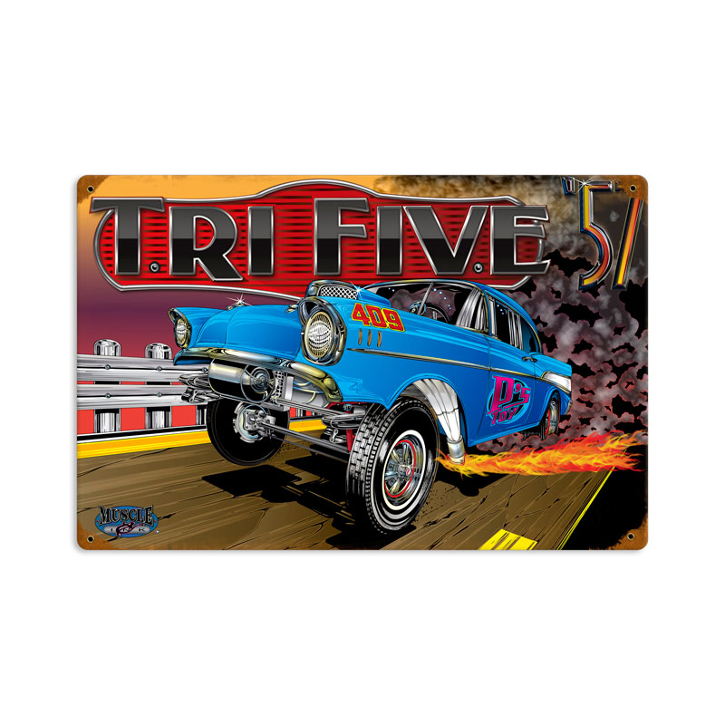 From the Muscle N Ink licensed collection, this Trifive Chevy vintage metal sign measures 12 inches by 18 inches and weighs in at 2 lb(s). This vintage metal sign is hand made in the USA using heavy gauge American steel and a process known as sublimation, where the image is baked into a powder coating for a durable and long lasting finish. It then undergoes a vintaging process by hand to give it an aged look and feel. This vintage metal sign