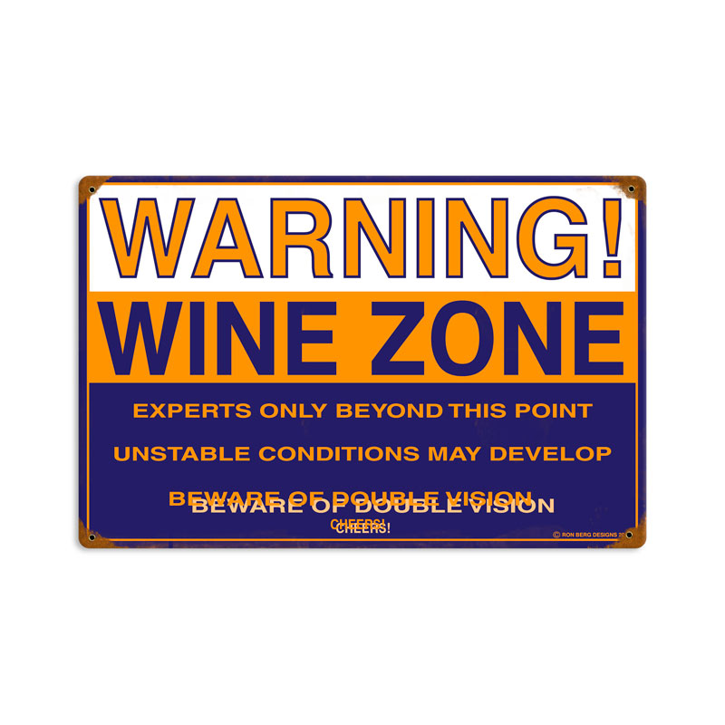 From the Ron Berg licensed collection, this Wine Zone vintage metal sign measures 18 inches by 12 inches and weighs in at 2 lb(s). This vintage metal sign is hand made in the USA using heavy gauge American steel and a process known as sublimation, where the image is baked into a powder coating for a durable and long lasting finish. It then undergoes a vintaging process by hand to give it an aged look and feel. This vintage metal sign