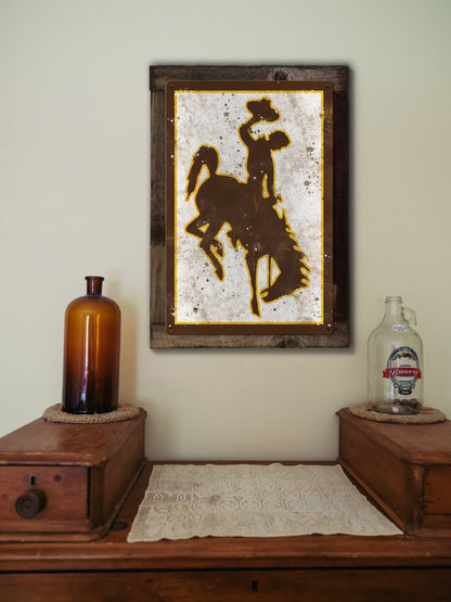 Wyoming Athletics Wall Art NCAA metal sign is made from 24 gauge American steel (No Flimsy Tin Here). Select from three different sizes: Large, Medium, Small. Also, available with an optional rustic wood frame. Designs are baked into a powder coating for a durable finish. Unlike other tin signs, canvas prints, and posters, our metal signs will not bend, fold, dent, or wrinkle over time. You can take a hammer to our signs. Our signs are hand made just like in the days. Rest assured these metal signs are made to last!